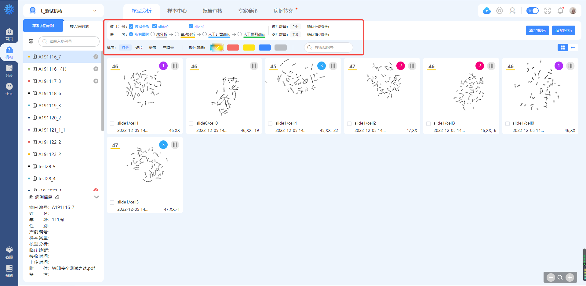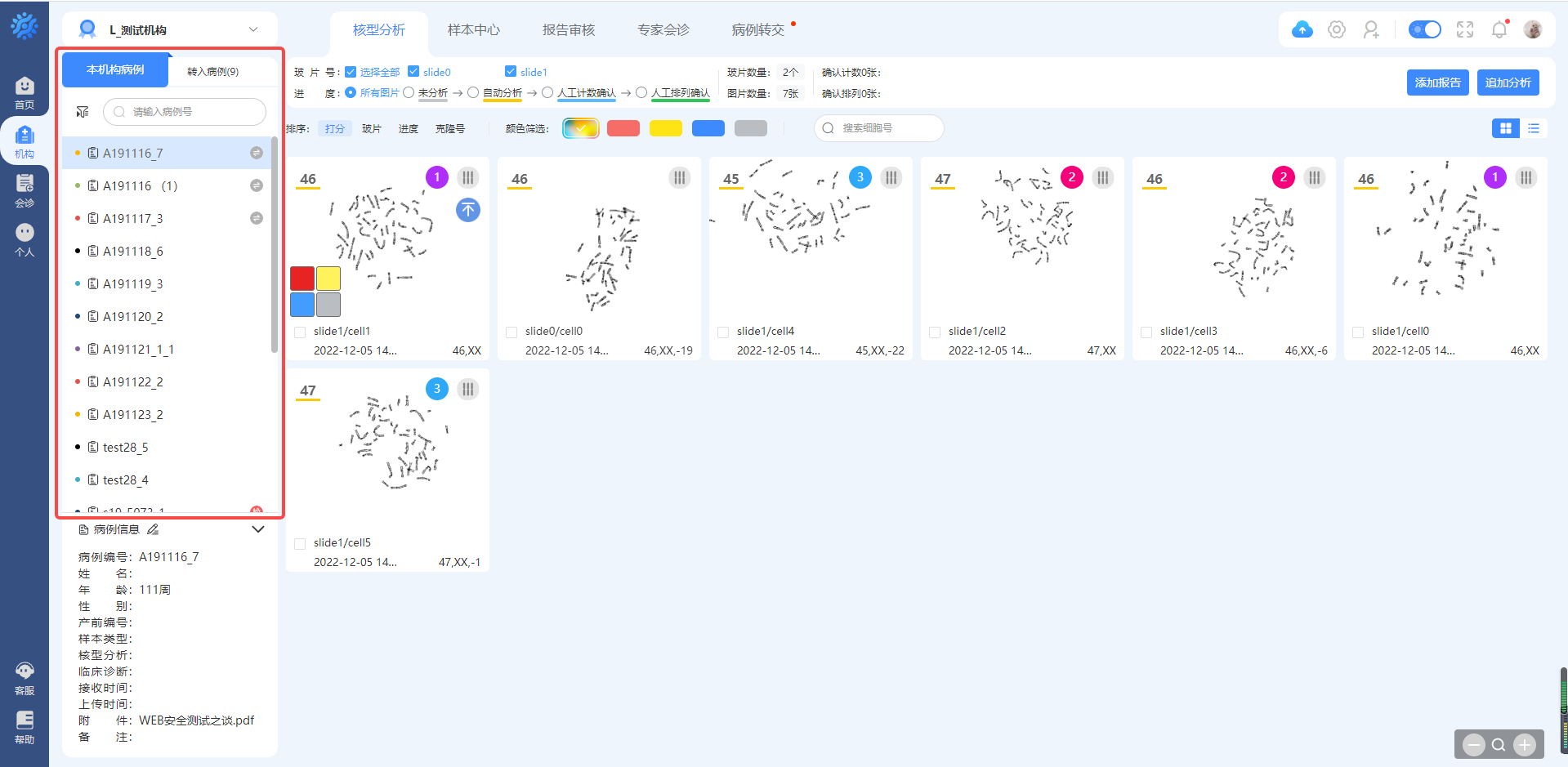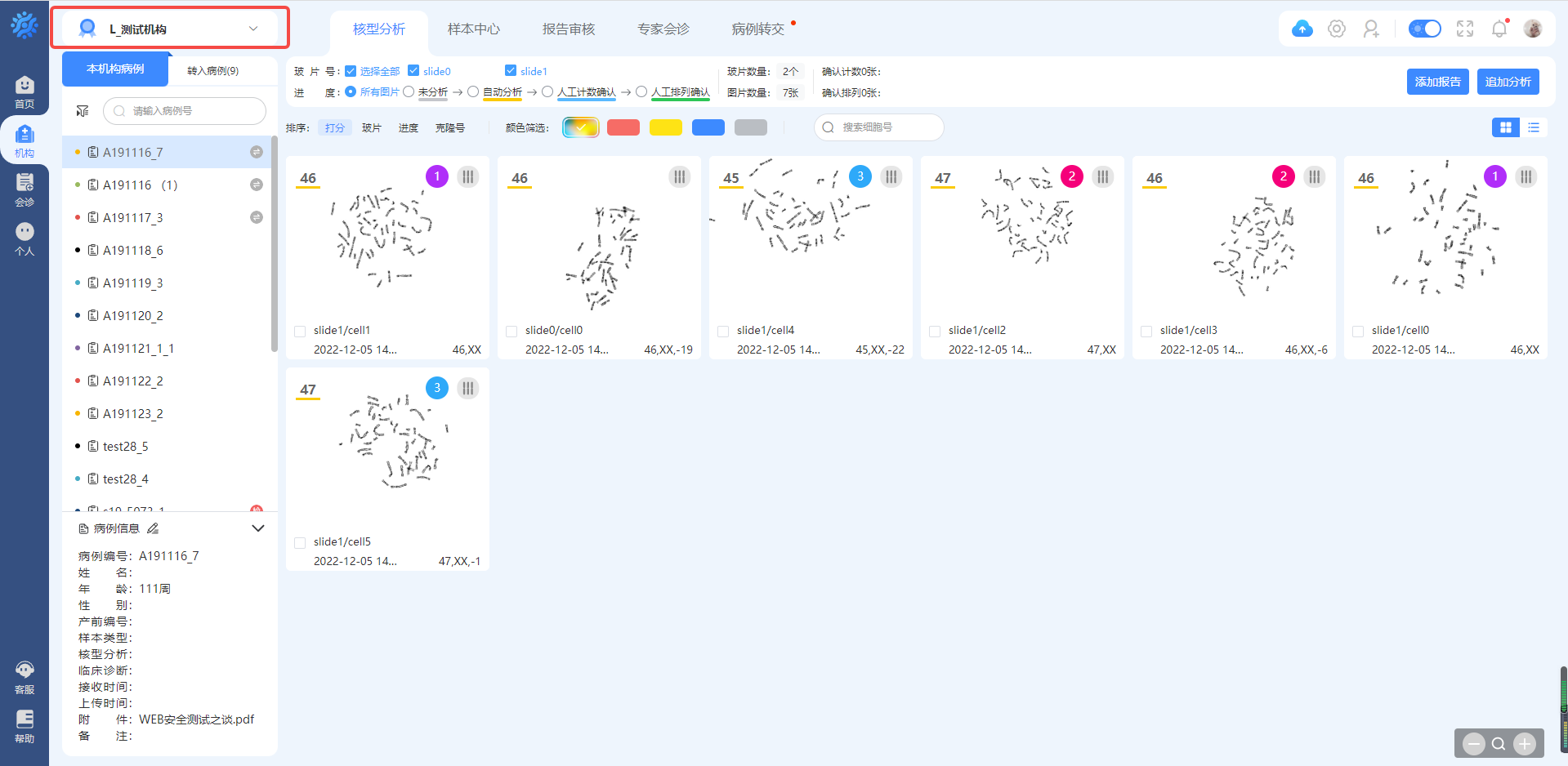进入机构后,首次进入在核型分析界面。在此页面,可查看查看病例情况,包括病例目录查看、病例核型图统计、核型图查看、报告添加等功能。