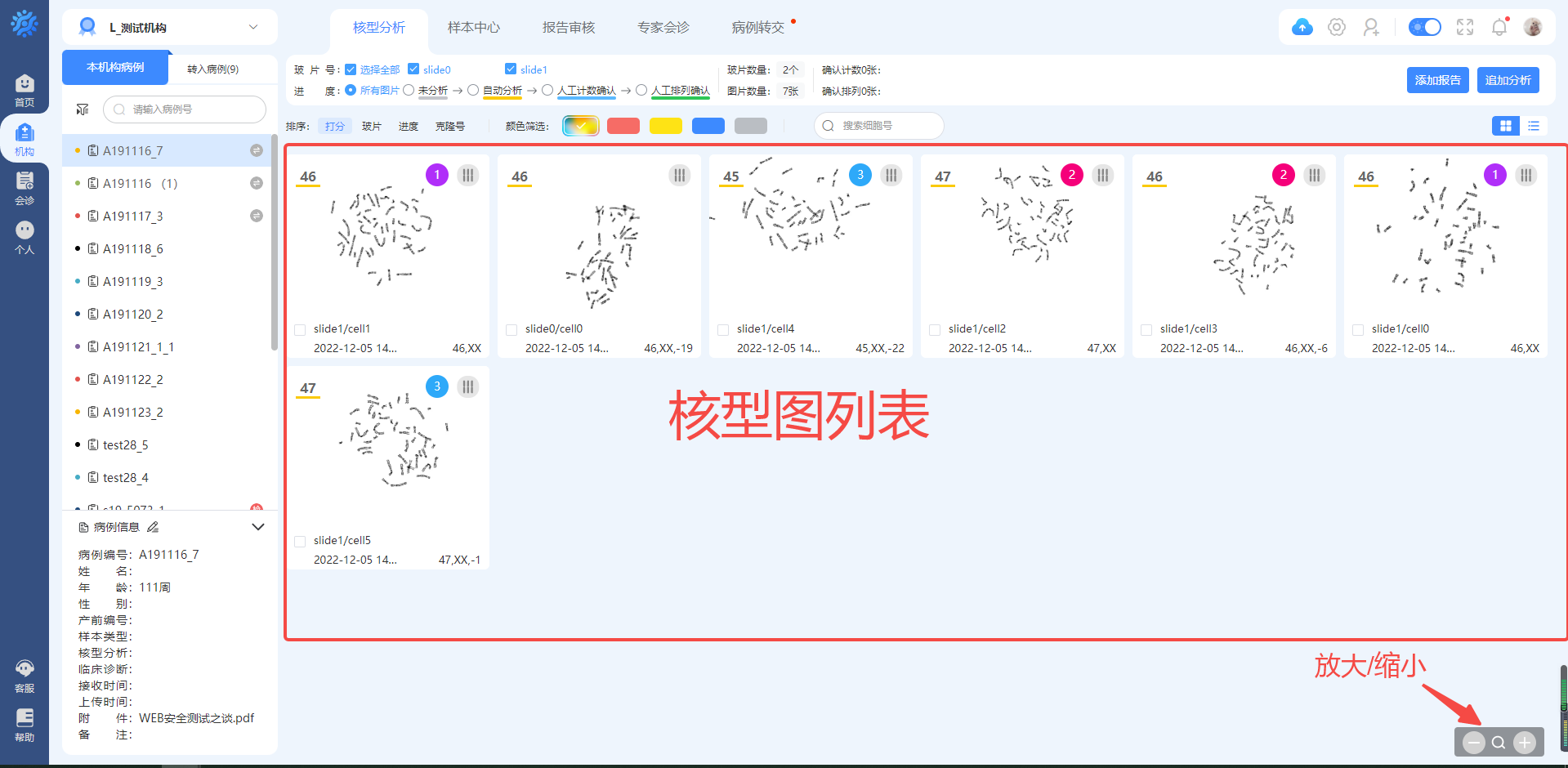 右边的区域是核型图列表,可以在这个区域查看当前病例下的核型图图像。