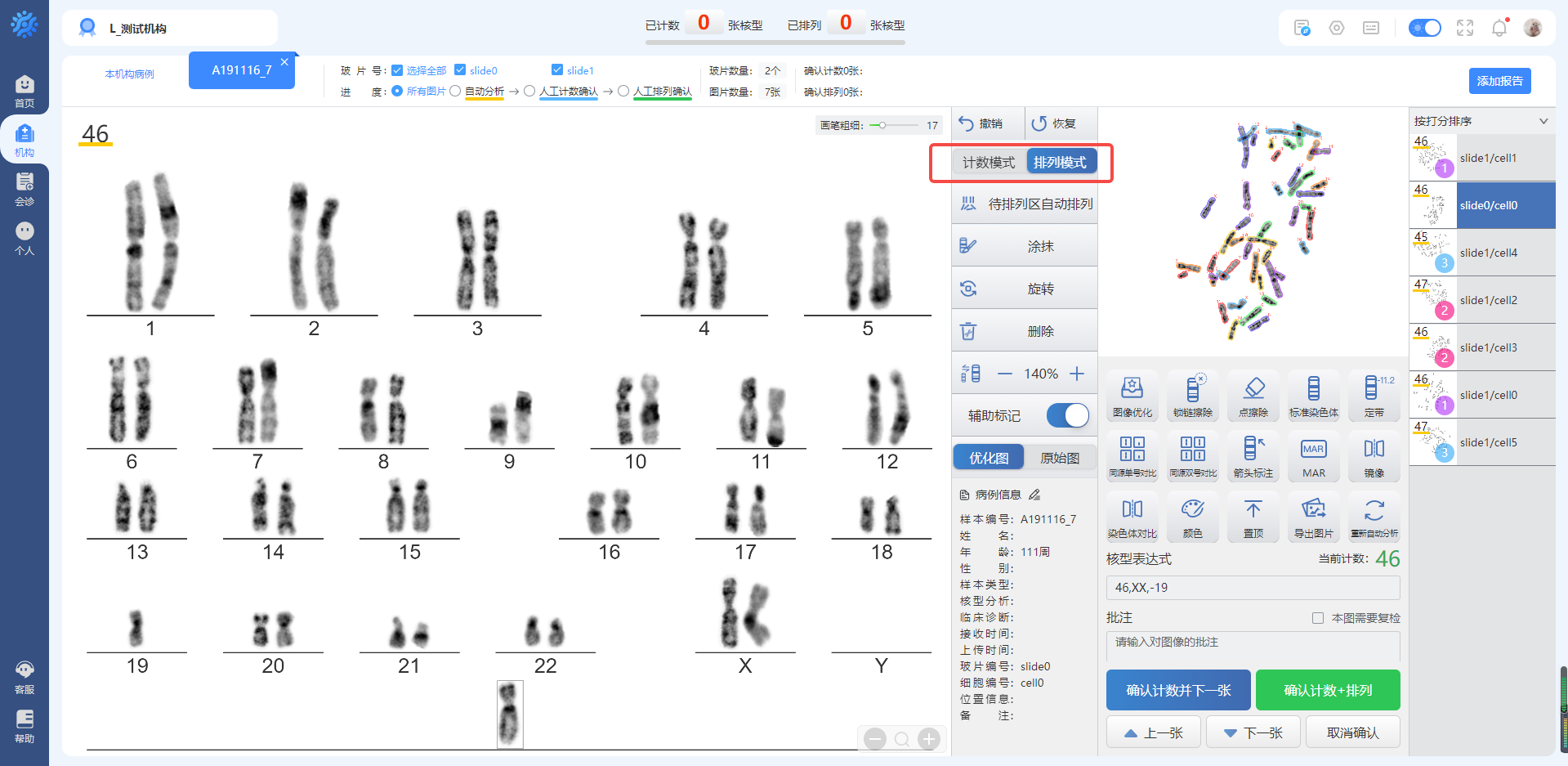 鼠标左击【排列模式】,进入排列模式,左边大图位置展示排列图,右边小图位置显示中期分裂相,可通过点击小图空白位置切换